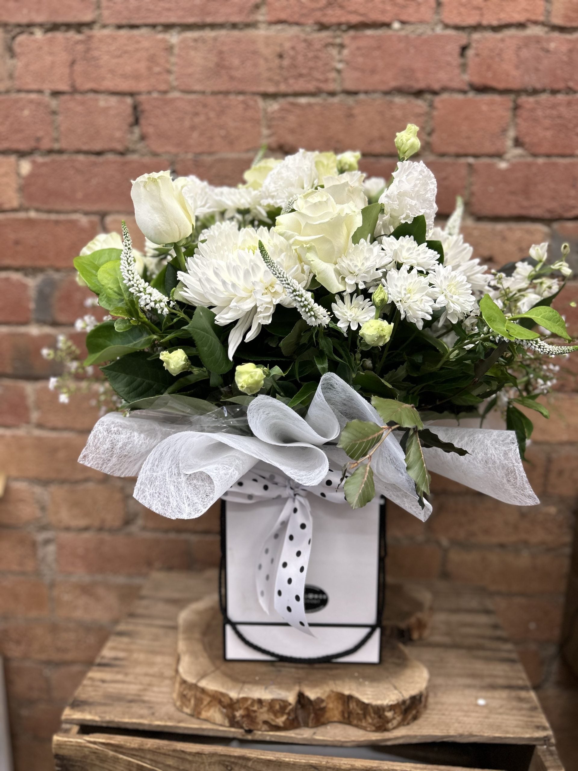 The White Box is a refined choice for sympathy flowers, thoughtfully arranged to convey your deepest condolences with elegance and care. Designed to bring comfort during difficult times, this arrangement features pristine white blooms that symbolize purity, peace, and remembrance.