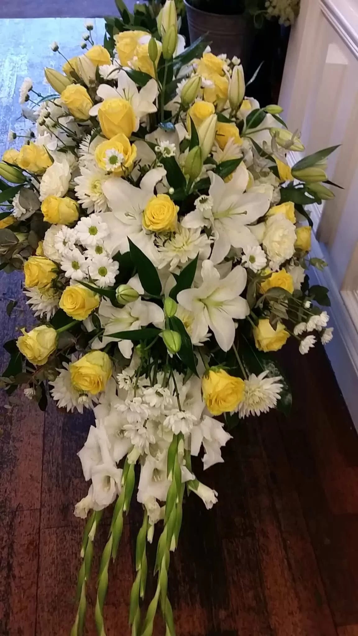 The Yellow White Casket Cover is a distinguished choice for expressing heartfelt condolences through sympathy flowers. This elegant floral arrangement combines soft yellow and pristine white blooms, creating a gentle and respectful tribute that honors the memory of a loved one with grace. The harmonious blend of colors symbolizes purity, remembrance, and hope—qualities that bring comfort during moments of grief. Specifically designed as sympathy flowers, this casket cover drapes beautifully over the casket, enhancing the solemnity of the funeral service and providing a serene focal point. Its thoughtfully selected blooms not only convey sympathy but also offer a visual message of support and compassion to grieving families.